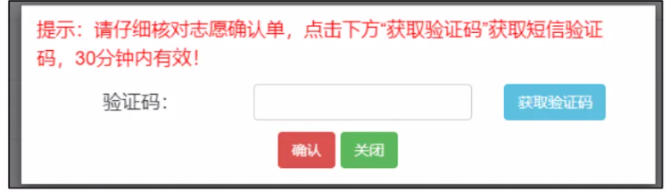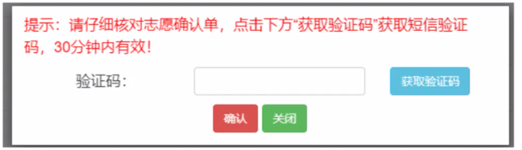 3、志愿确认:选择好志愿后点击“保存”,输入短信验证码后点击“确认”