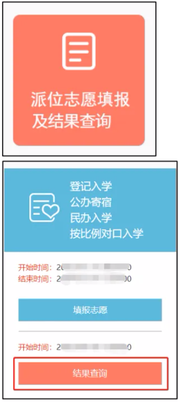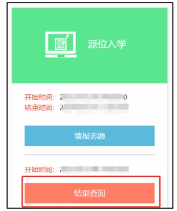 家长在规定时间登录“平台”,进入“派位志愿填报及结果 查询”,点击“结果查询”。