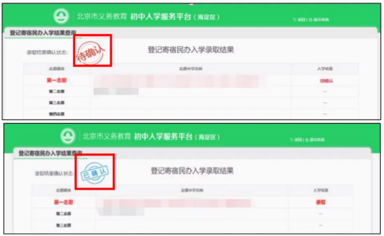 (二)登记入学、公办寄宿、按比例对口直升入学录取结果查询以及民办入学派位录取确认