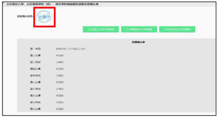 当看到蓝色“已确认”图标,表示本次志愿填报成功。(在志愿填报时间内,志愿可以反复修改确认,也可以清空志愿,放弃本次派位)