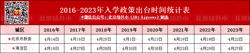 参考近几年,北京市义务教育政策、海淀区入学政策集中于四月中下旬发布,详细时间可参考下图: