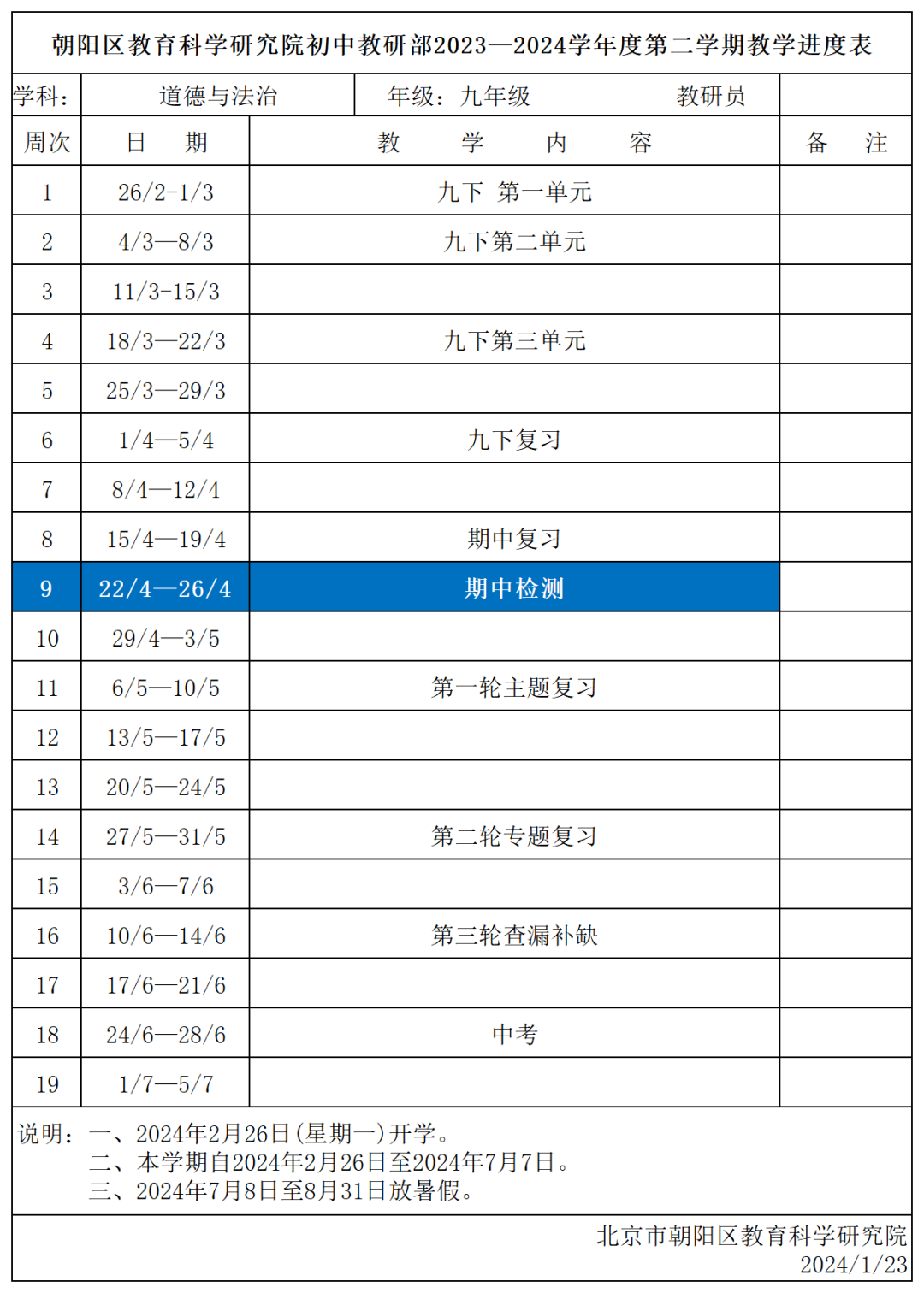 朝阳区初中将在4月22日-4月26日进行期中考试: