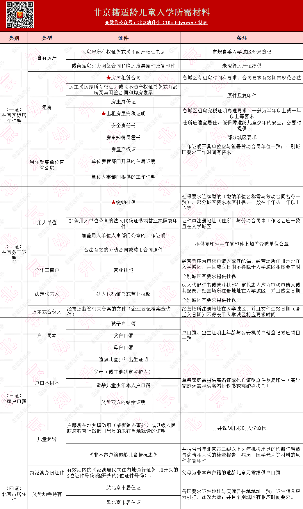 非京籍四证主要包括在京实际居住证明、在京务工就业证明、北京市居住证、全家户口簿,详细点击查看:北京16区2023年非京籍入学政策审核细则汇总