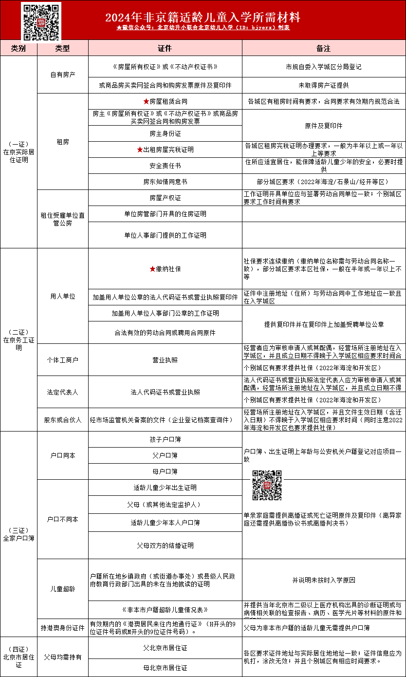 温馨提示:北京各区非京籍入学材料要求不同,详细点击查看→2024年北京幼升小16区非京籍四证材料清单及入学要求(社保、居住证、租房税...)