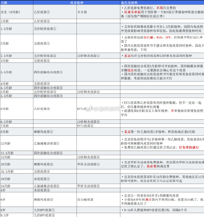 北京市新出生-10岁前的疫苗接种程序,北京的家长都可以参考,并且在和其他地区免疫程序不同的地方进行了备注: