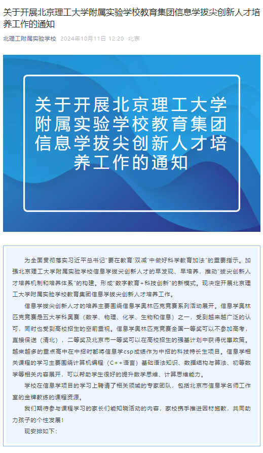 关于开展北京理工大学附属实验学校教育集团信息学拔尖创新人才培养工作的通知