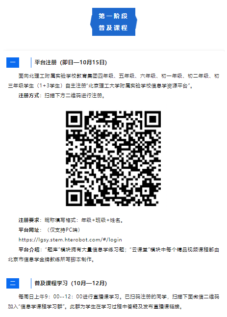 面向北理工附属实验学校教育集团四年级、五年级、六年级、初一年级、初二年级、初三年级学生(1+3学生)自主注册“北京理工大学附属实验学校信息学资源平台”。