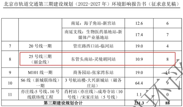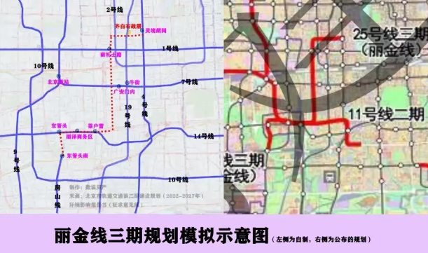 根据此前北京轨道交通三期规划中涉及“丽金线”的公示内容,25号线三期(丽金线)共设8座车站,南端的东管头南站为25号线(房山线)的既有车站,北端为灵境胡同站。