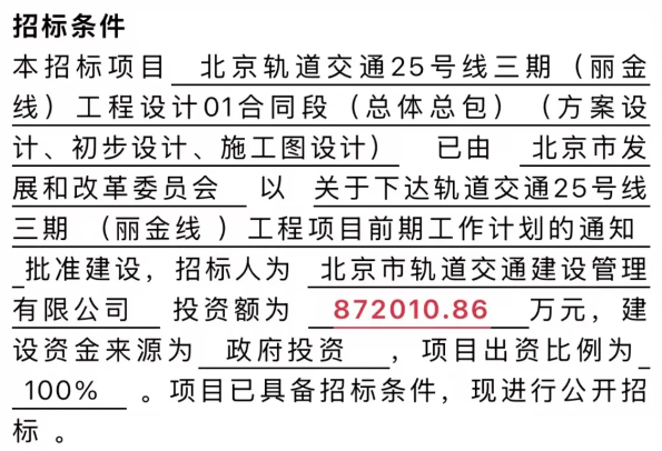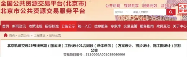 北京轨道交通25号线三期(丽金线)发布系列工程设计、勘察招标公告。