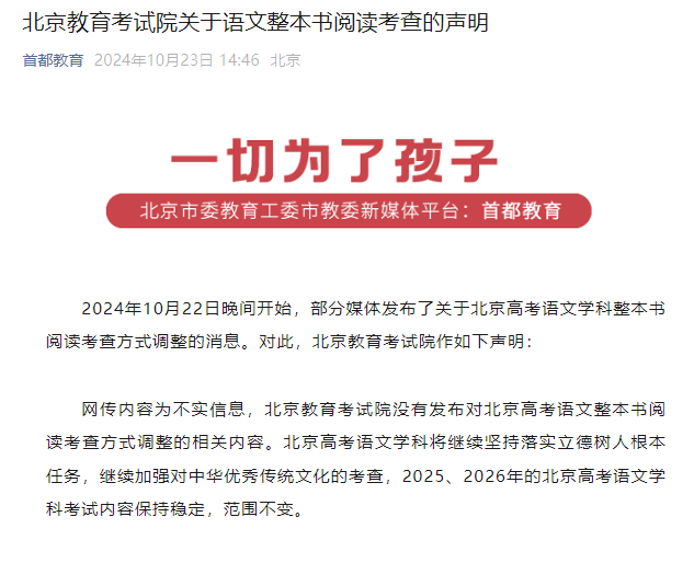 2024年10月22日晚间开始,部分媒体发布了关于北京高考语文学科整本书阅读考查方式调整的消息。对此,北京教育考试院作如下声明: