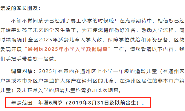 调查对象:2025年有意向在通州区上小学一年级的适龄儿童(有通州区户籍或本市外区户籍监护人房产在通州区的儿童;在通州区居住的非本市户籍儿童)及未正常入学的超龄儿童均需参加此次调查。
