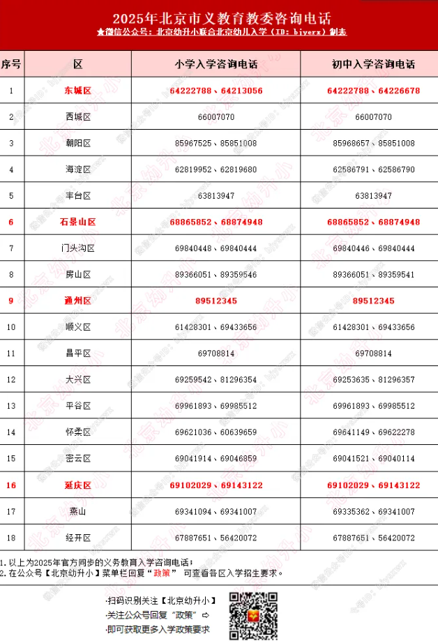 多区有变!官方公布了2025年北京16区义务教育入学咨询电话!今年入学家长请务必收藏本文,如有入学困惑,可在工作时间段内拨打咨询~