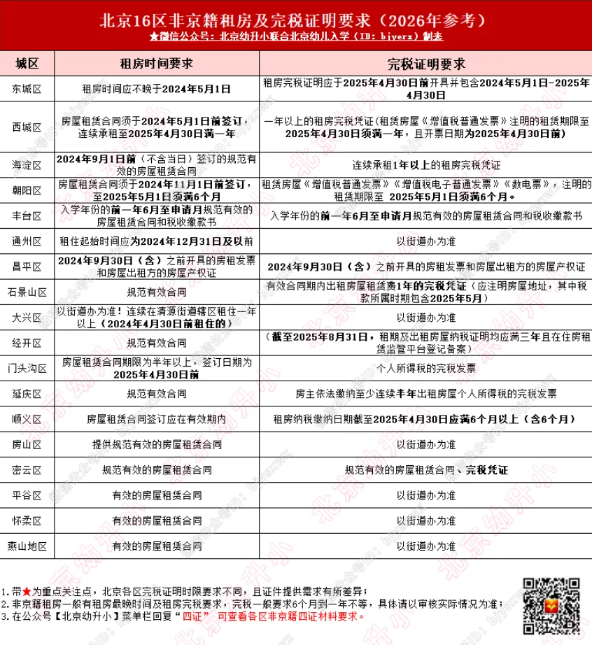 2026年非京籍幼升小家长注意,多区明确要求提前缴纳租房税!想知道外地孩子租房入学需缴纳多长时间的租房税(完税证明)?快与#北京幼升小(ID:bjysxwx)京京老师一起来看看~