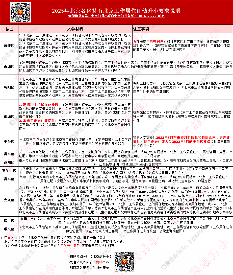 2026年幼升小注意,持工作居住证幼升小也要满足目标城区相关要求,北京各区对持工作居住证幼升小的要求,大家可以参考对照: