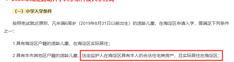 比如海淀区幼升小入学条件中明确:具有本市其他区户籍的适龄儿童,法定监护人在海淀区具有本人的合法房产,且实际居住在海淀区;