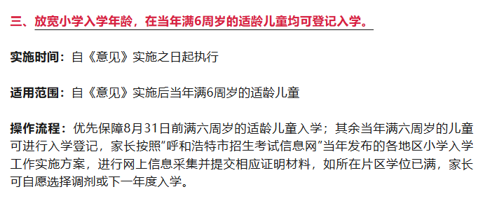 呼和浩特市放宽小学入学年龄在当年满6周岁的适龄儿童均可登记入学