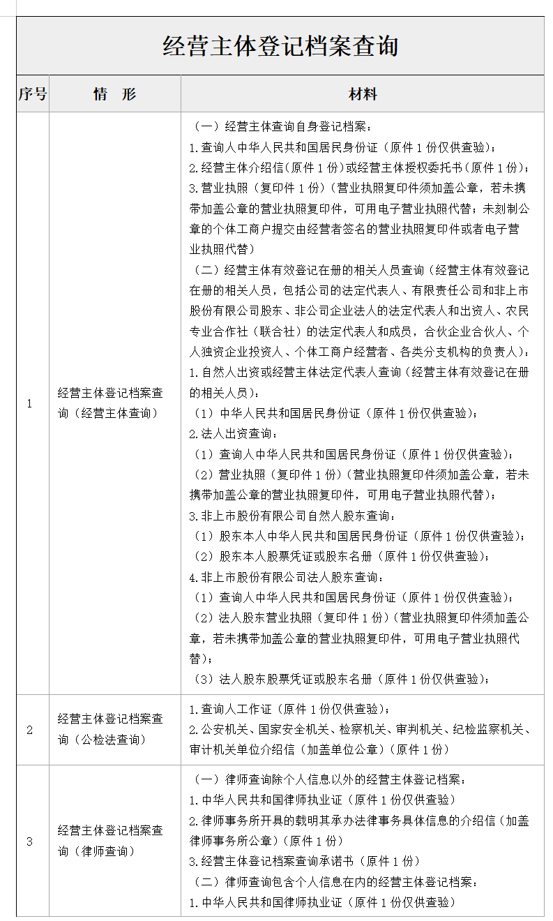 答:(1)经营主体介绍信或经营主体授权委托书、经营主体营业执照复印件(加盖公章)(若未携带营业执照复印件盖公章,可用电子营业执照代替)、经办人身份证原件;(2)经营主体的法定代表人本人持身份证原件;(3)经营主体的法人股东持营业执照复印件(加盖公章)(若未携带营业执照复印件盖公章,可用电子营业执照代替)及经办人身份证原件;(4)经营主体的自然人股东持身份证原件;