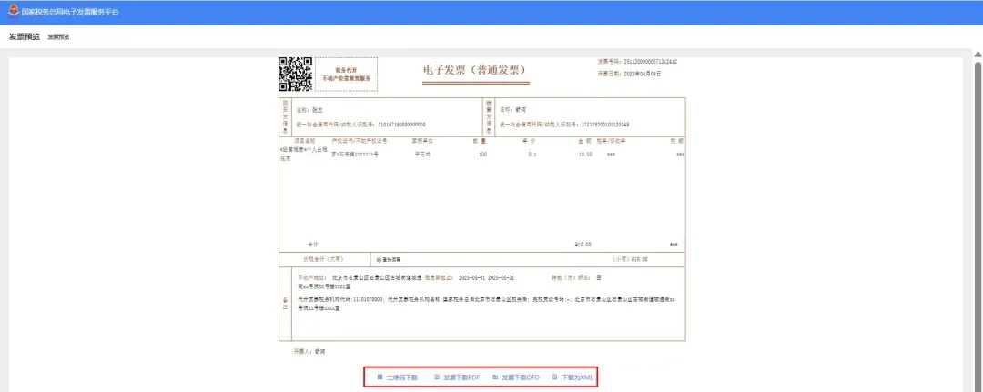 开具成功后,点击【下载】,进入发票预览界面。点击相应的按钮,选择“二维码下载”“发票下载PDF”“发票下载OFD”和“下载为XML”等不同的下载方式进行下载。