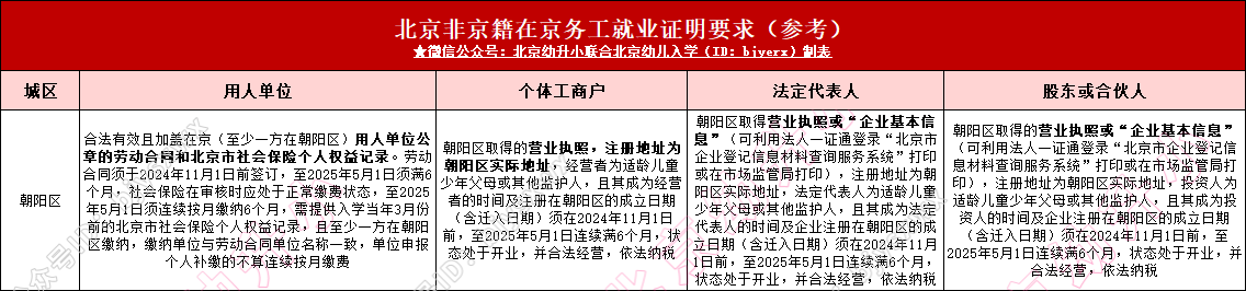 4.适龄儿童少年父母或其他监护人为股东或合伙人的审核标准:具有在朝阳区取得的营业执照或“企业基本信息”(可利用法人一证通登录“北京市企业登记信息材料查询服务系统”打印或在市场监管局打印),注册地址为朝阳区实际地址,投资人为适龄儿童少年父母或其他监护人,且其成为投资人的时间及企业注册在朝阳区的成立日期(含迁入日期)须在2024年11月1日前,至2025年5月1日连续满6个月,状态处于开业,并合法经营,依法纳税