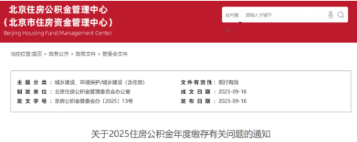 9月18日,北京住房公积金管理中心发布《关于2025住房公积金年度缴存有关问题的通知》