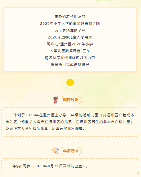 北京通州、经开区2026年小学入学数据调查填报即将截止,调查面向有两区户籍或居住房产的适龄及超龄儿童,需登录对应平台注册填报真实信息,部分区域需打印调查表留存未参与可能影响入学,建议错峰操作避免逾期。