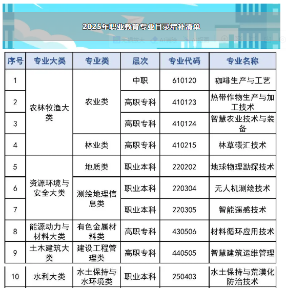 近日,教育部发布《教育部办公厅关于做好2026年职业教育拟招生专业设置管理工作的通知》,随文发布《2025年职业教育专业目录增补清单》。