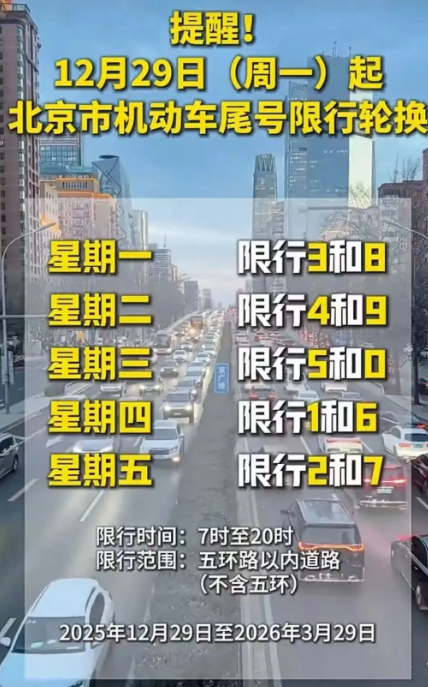 2025年12月29日至2026年3月29日,周一至周五限行机动车车牌尾号分别为:3和8、4和9、5和0、1和6、2和7。(车辆尾号为英文字母的按0管理)