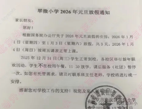 2026年元旦倒计时!北京多所中小学调整作息提前放学