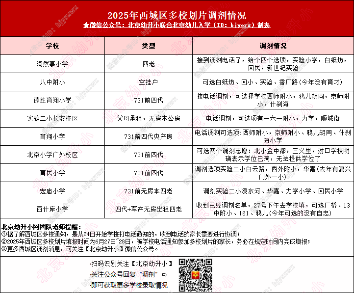 西城区四老房产、四代房产、租房、空挂户等情况下或涉及协调入学,西城区幼升小家长需先根据西城区小学招生简章到校报名,学校、学区会为家长进行协调,以下是目前收集到的协调信息: