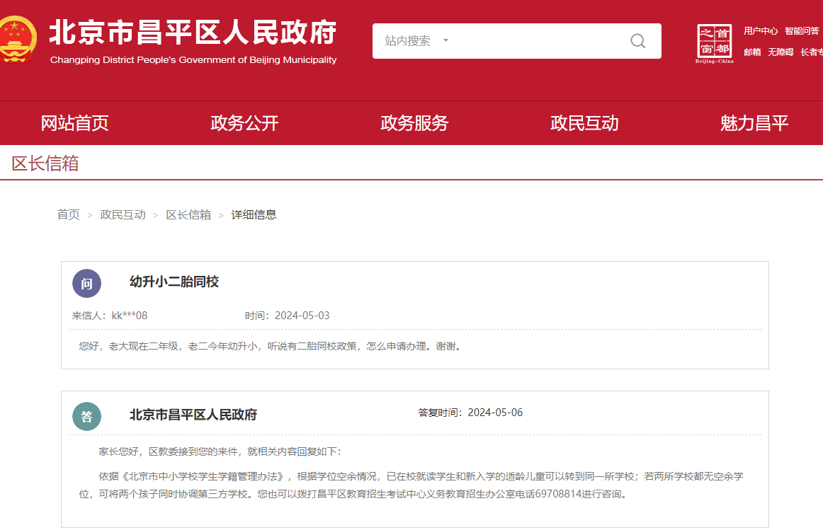 根据昌平区人民政府答复家长疑问,昌平区二孩同校申请方法为: