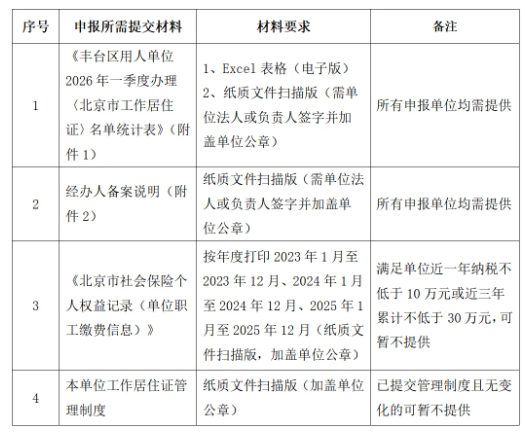 《关于报送2026年<北京市工作居住证>办理需求的申请》(加盖单位公章、法人签字);