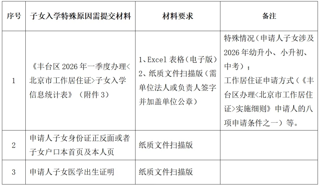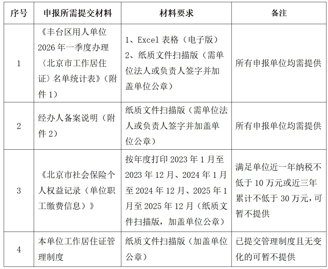 (二)《丰台区用人单位2026年一季度办理〈北京市工作居住证〉名单统计表》(附件1)、《丰台区2026年一季度办理〈北京市工作居住证〉子女入学信息统计表》(附件3)需提供电子版和纸质文件扫描版,纸质文件扫描版需单位法人或负责人签字并加盖单位公章,其他材料只需提供电子版或扫描件即可。