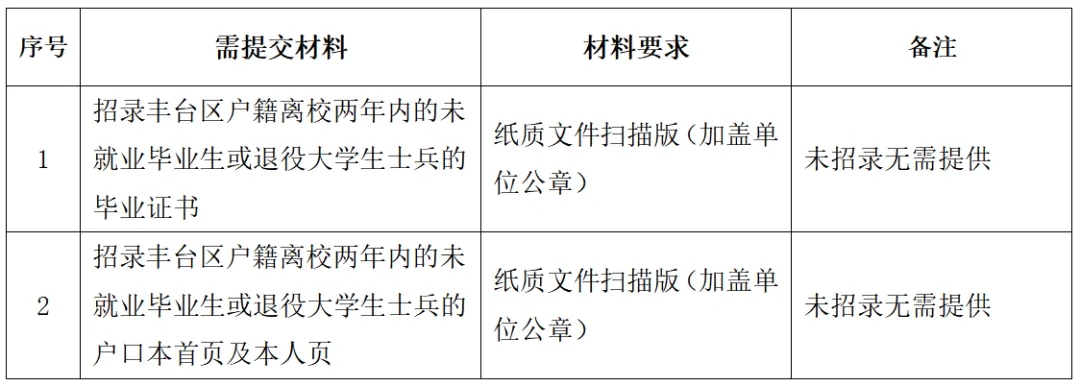 (三)单位近三年招录丰台区户籍离校两年内的未就业毕业生或退役大学生士兵除上述材料外还需将以下材料发送至邮箱: