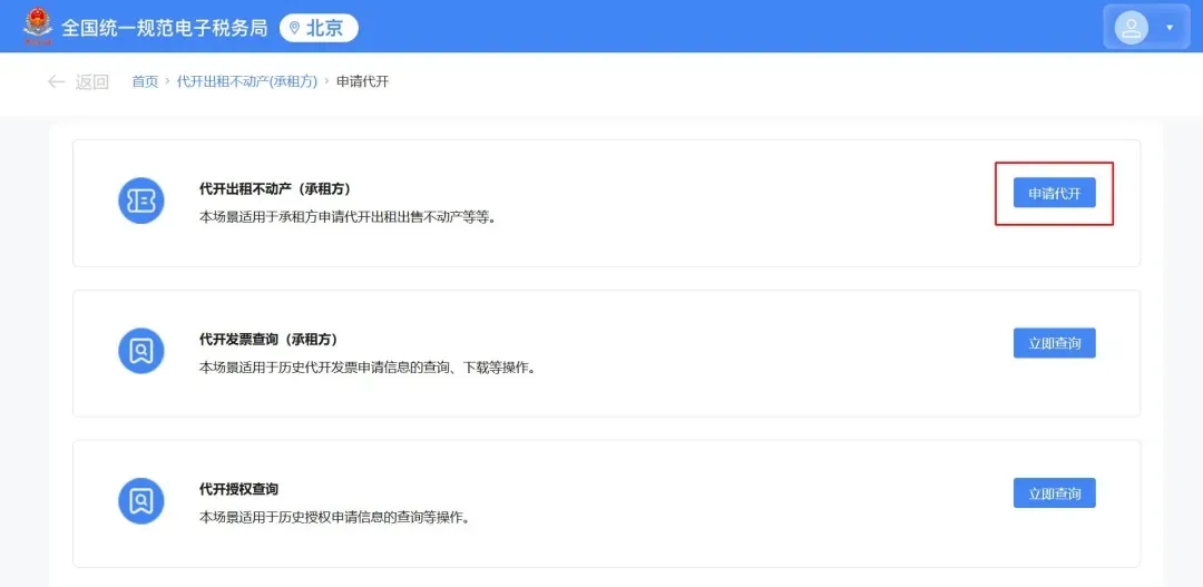 点击【申请代开】。操作与以上出租方申请代开的步骤相同。