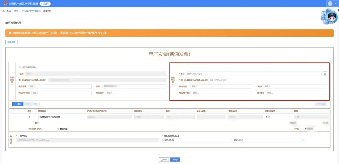 1.如本次授权代开的发票涉及税款缴纳,则缴纳的税款归属于出租方。授权范围仅针对代开发票行为,若后续需要对授权代开的发票进行作废、红冲、退税等操作,只能由出租方自行申请处理,请务必仔细核对信息后谨慎开具。