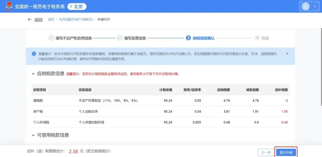 2.确认无误后点击【提交申请】,申请提交后,需要出租方进行授权才可继续办理。授权通过后,您可继续开票操作。