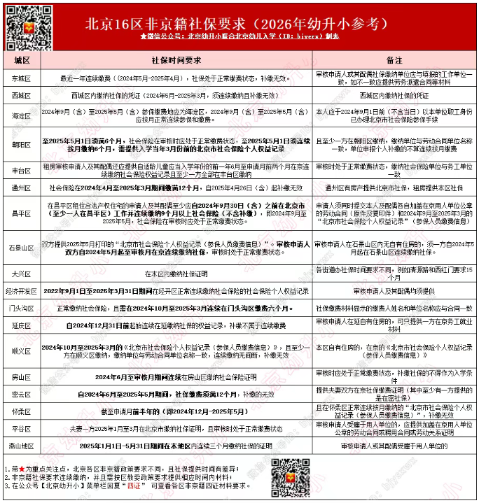 北京16区非京籍社保要求不同!多区明确要求至少一方提供本区社保!详情往下看↓