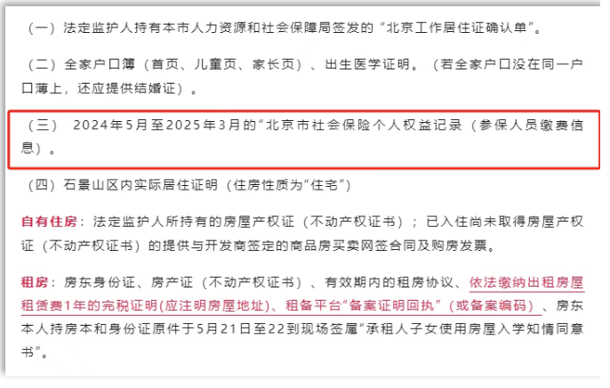 2026年北京幼升小无房京籍在非户籍区租房入学,要求在入学城区工作并居住满三年,提供截至入学当年五月前,连续缴纳且满三年的社保权益记录!