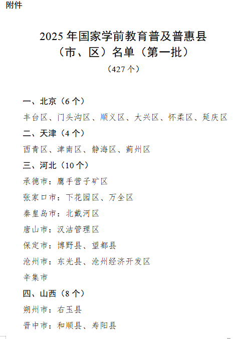 按照《中共中央 国务院关于学前教育深化改革规范发展的若干意见》要求以及《县域学前教育普及普惠督导评估办法》规定,通过县级自评、市级初核、省级评估、国家认定的程序,2025年第一批认定北京市丰台区等427个县(市、区)为国家学前教育普及普惠县。其中,天津、上海两个直辖市全域通过国家评估认定;内蒙古乌海市,江苏省无锡市、镇江市,浙江省杭州市、嘉兴市、金华市、丽水市、舟山市,山东省滨州市,海南省三沙市,四川省宜宾市,贵州省铜仁市,甘肃省嘉峪关市,新疆维吾尔自治区克拉玛依市、昌吉回族自治州、哈密市等16个市(州)全域通过国家评估认定(名单见附件)。