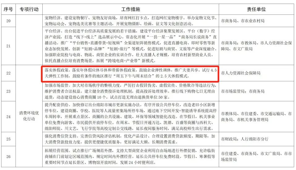 近日,四川省绵阳市商务局印发《绵阳市提振消费专项行动2025年工作清单》(下称“《清单》”)。其中明确试行4.5天弹性工作制,鼓励有条件的地区推行“周五下午与周末结合”的2.5天休假模式: