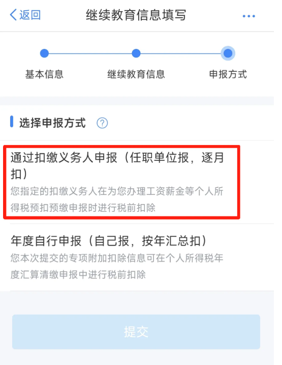 选择申报方式为【通过扣缴义务人申报】,即可在预扣预缴时享受专项附加扣除;或者选择【年度自行申报】,将在汇算清缴时享受专项附加扣除。