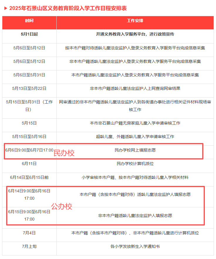 北京小学入学志愿填报民办校一般在6月初进行,公办校一般集中在六月中下旬开展,派位在七月初进行,以2025年石景山区义务教育阶段入学工作日程安排表为例:
