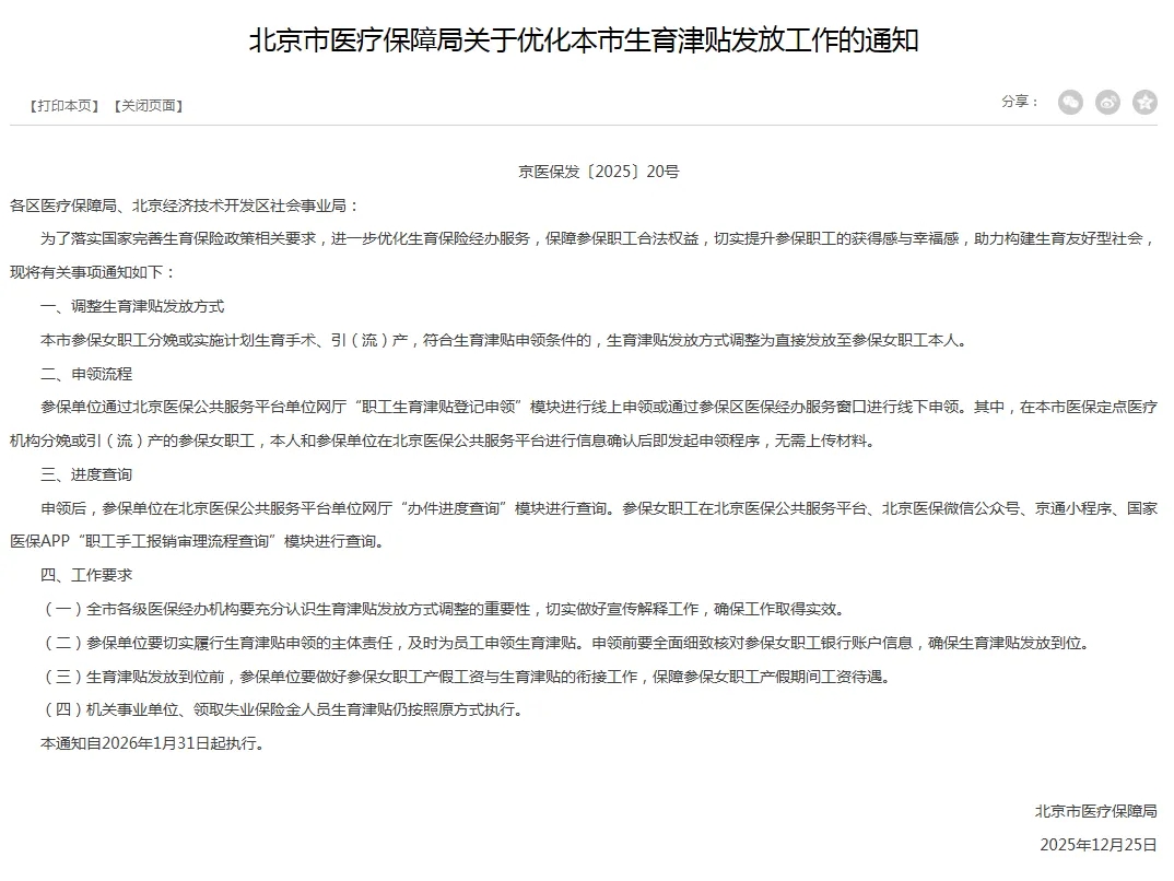 《北京市医疗保障局关于优化本市生育津贴发放工作的通知》明确,2026年1月31日起,北京市参保女职工分娩或实施计划生育手术、引(流)产,符合生育津贴申领条件的,生育津贴将直接发放至参保女职工本人。