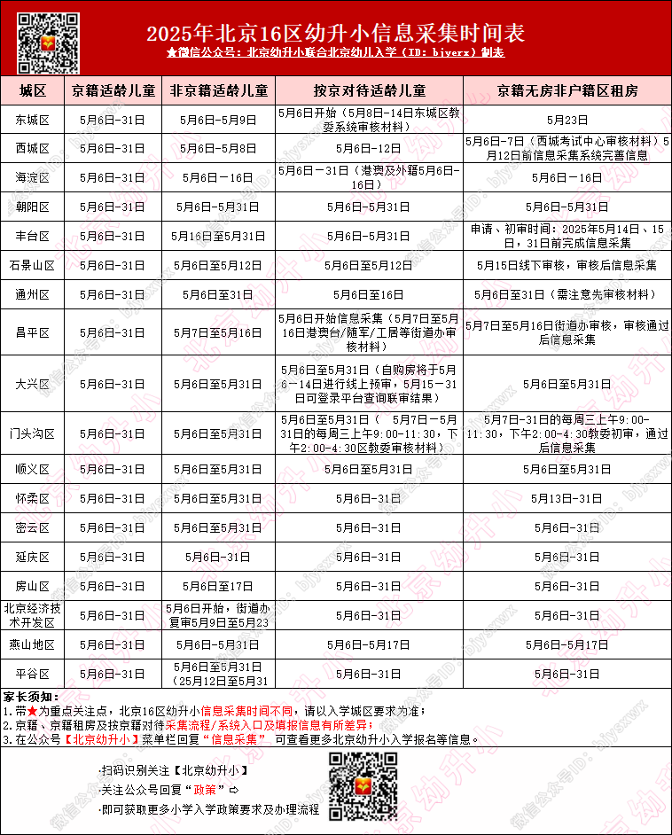 北京市义务教育入学服务平台将在5月正式开放,且将于5月31日截止填报。但各区、各户籍具体填报时间不同,需要以2026年北京16区义务教育幼升小小升初入学时间日程安排表汇总规定的信息采集时间为准,2026年家长当下可先行参考2025年填报时间: