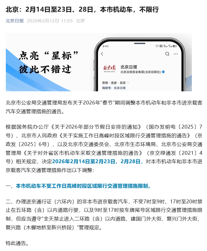 根据国务院办公厅《关于2026年部分节假日安排的通知》(国办发明电〔2025〕7号)、北京市人民政府《关于实施工作日高峰时段区域限行交通管理措施的通告》(京政发〔2025〕6号),以及北京市交通委员会、北京市生态环境局、北京市公安局交通管理局《关于对外省区市机动车采取交通管理措施的通告》(京交绿通发〔2021〕4号)相关规定,决定2026年2月14日至2月23日、2月28日,对本市机动车和非本市进京载客汽车交通管理措施作出以下调整: