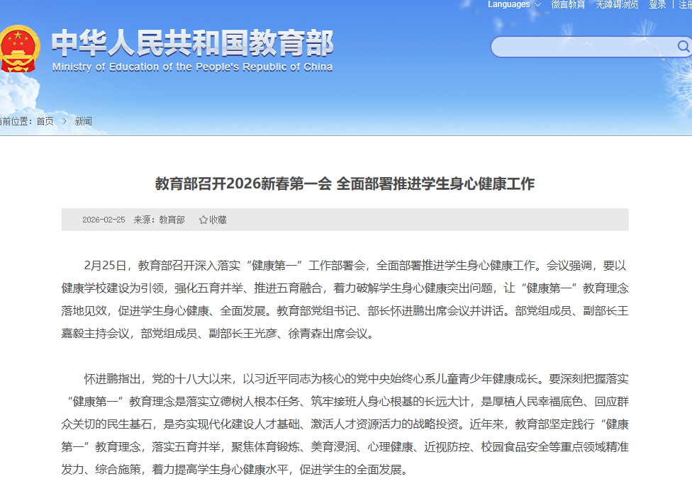 2026年新春之际,教育部召开新年首场重要会议,会议核心聚焦学生身心健康工作,全面且细致地部署推进各项举措,旨在为广大学生营造良好成长环境,助力青少年身心全面健康发展,开启教育新篇章,详情请查看下文。