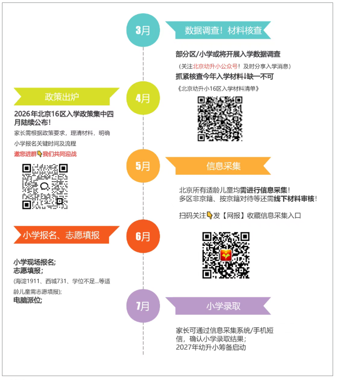 从北京幼升小报名时间来看,幼升小政策出台后,官方将发布小学入学招生时间安排表,家长务必重点关注信息采集、材料审核、小学报名等关键时间点,错过任一环节将有影响!