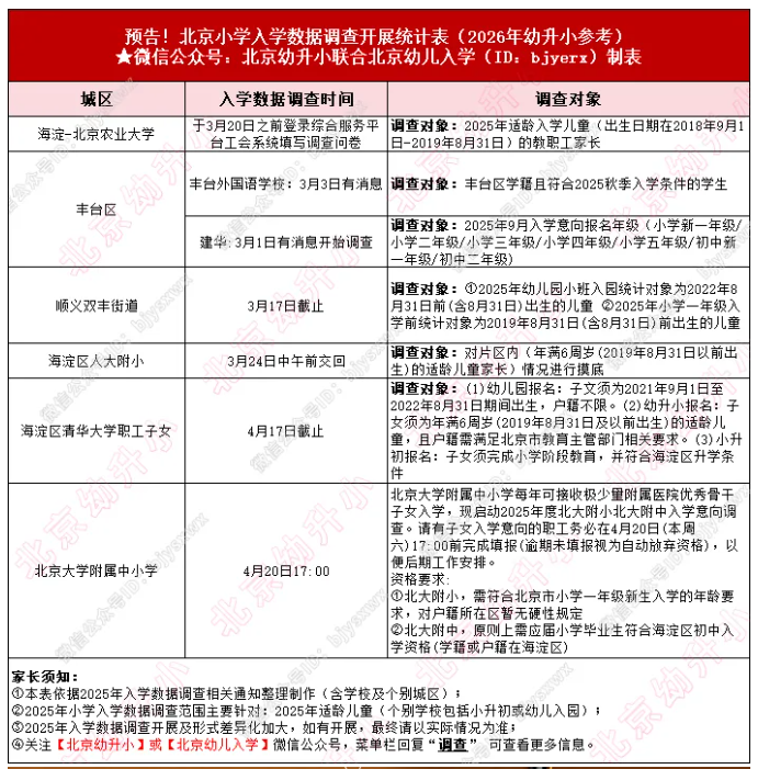 除以上调查外,接下来,西城、海淀、丰台等区,2026年小学入学数据调查即将来袭!如下为往年开展,仅供参考。