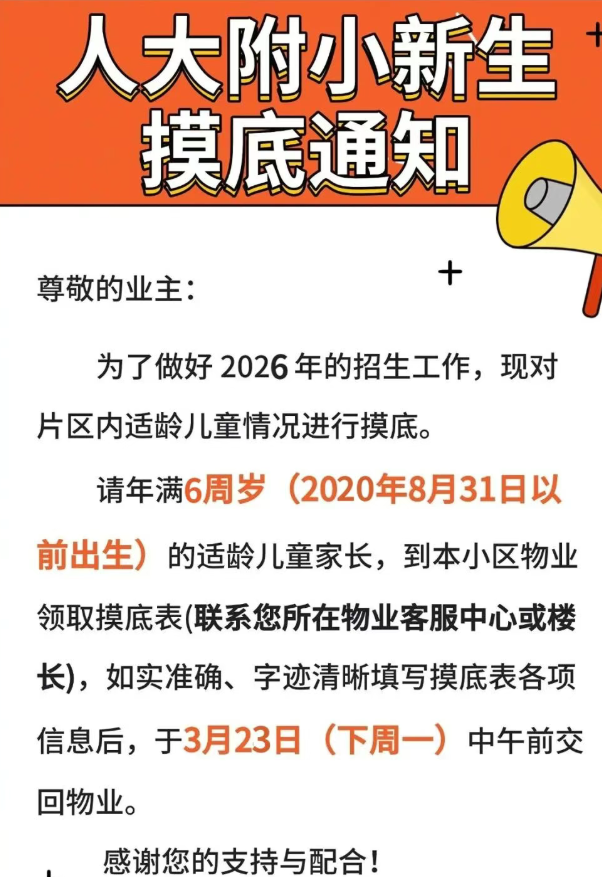📢特别提醒:按照往年入学数据调查安排来看,接下来海淀人大附小,将公布摸底调查,在招生范围内的适龄儿童需按要求,到小区领取摸底表,完成填报后,交回物业。