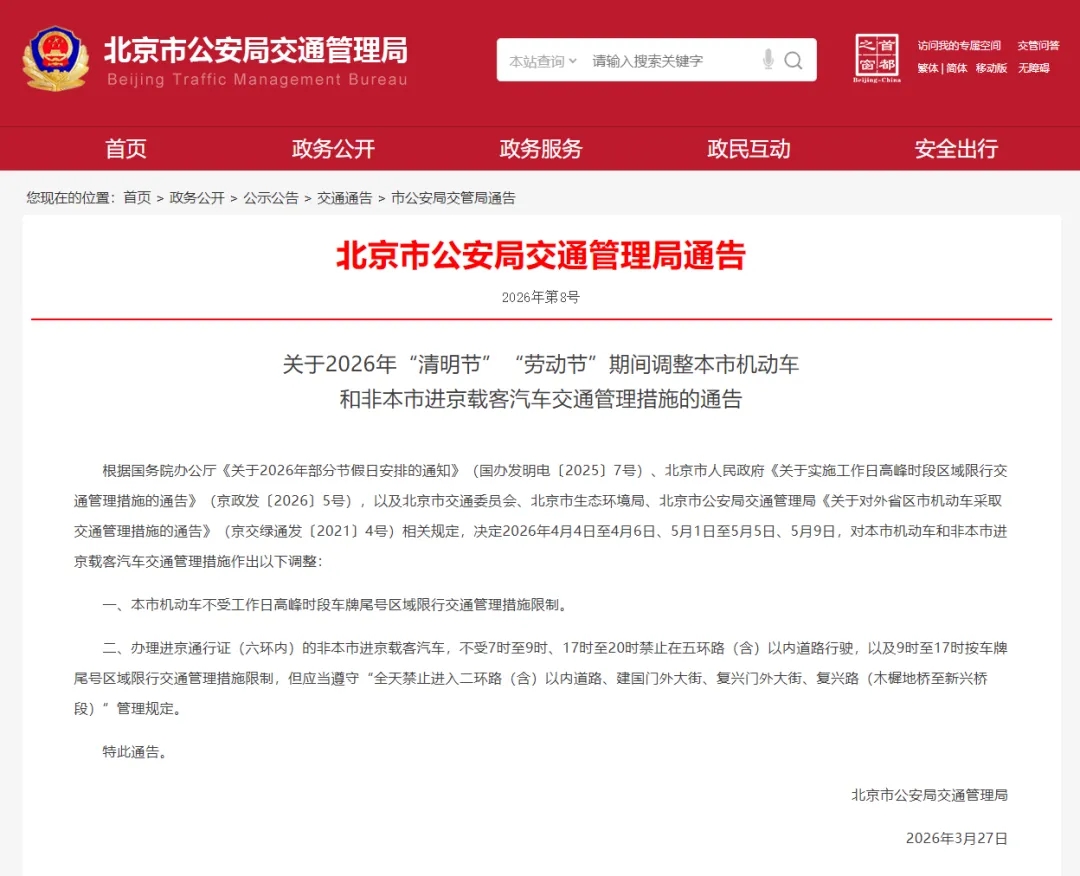 北京市公安局交通管理局3月27日发布《关于2026年“清明节”“劳动节”期间调整本市机动车和非本市进京载客汽车交通管理措施的通告》。